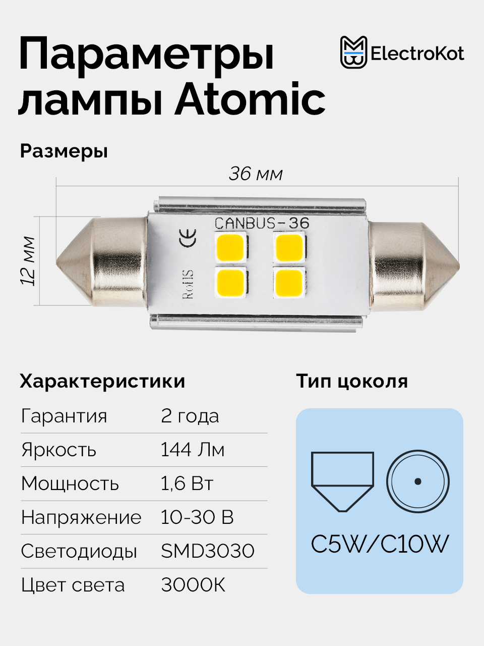 - 2 х Светодиодная лампа ELECTROKOT Atomic C5W 36mm 3000K