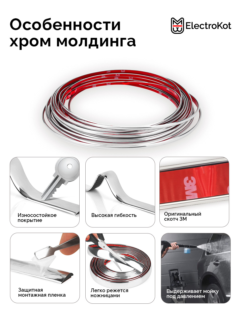 Отлично подойдет для отделки салона, приборной панели, дверей. Очень эффектно смотрится тонкой хромированной полосой. Лента очень хорошо гнется во всех плоскостях, не боится солнца, воды и мороза. Благодаря сверхсильному скотчу 3М будет держаться долгие годы. Легко и ровно режется до необходимой длины.