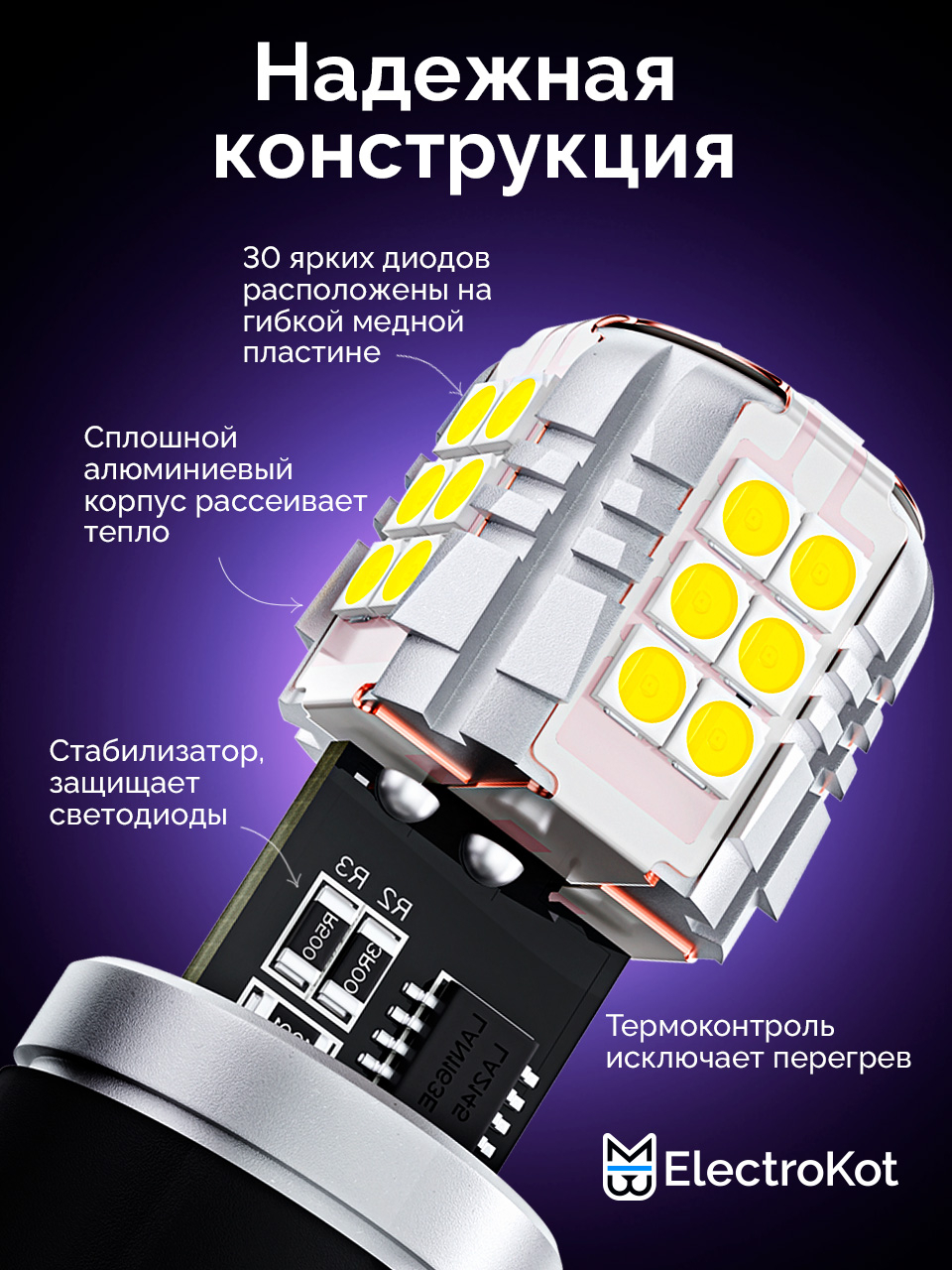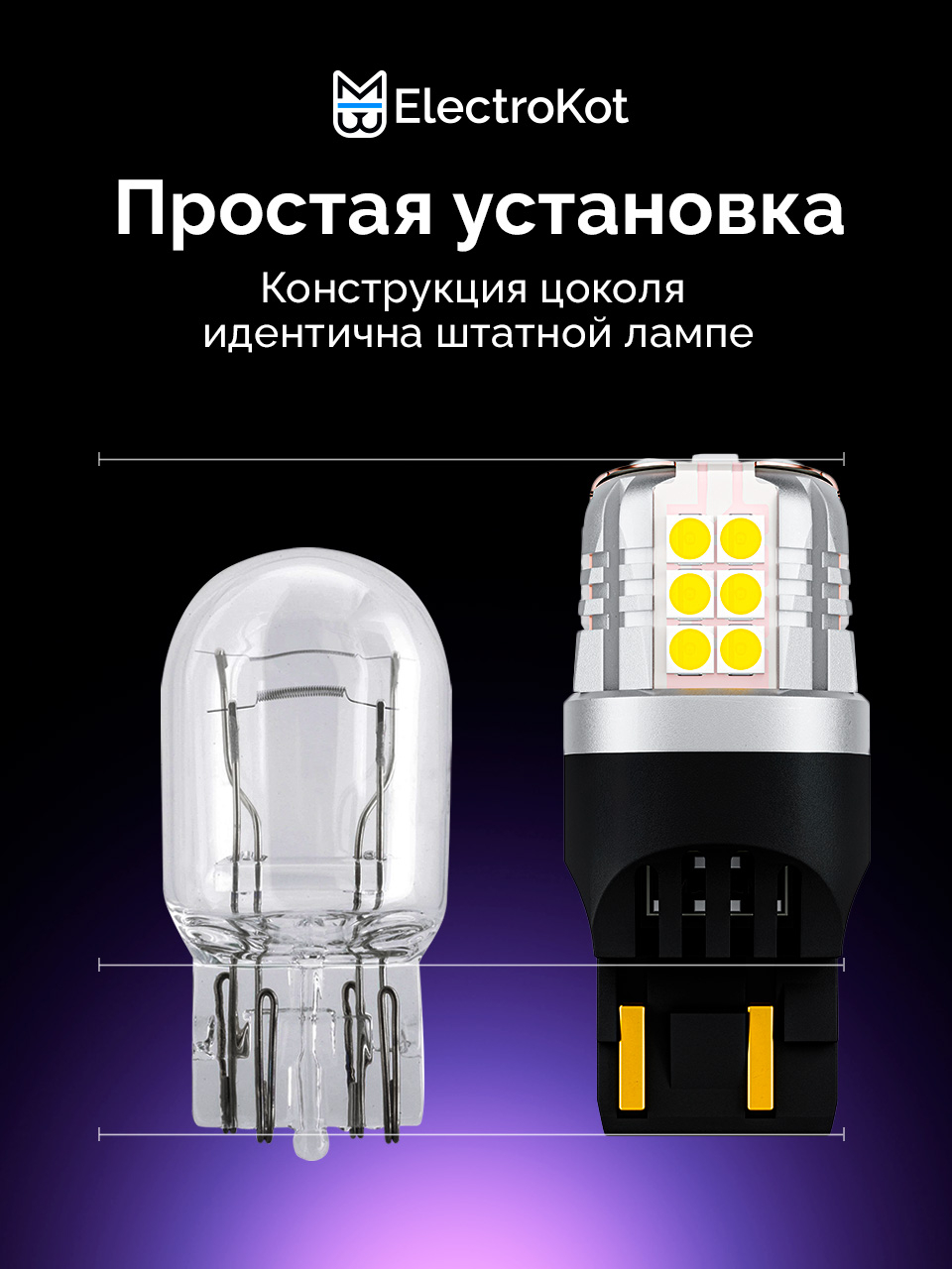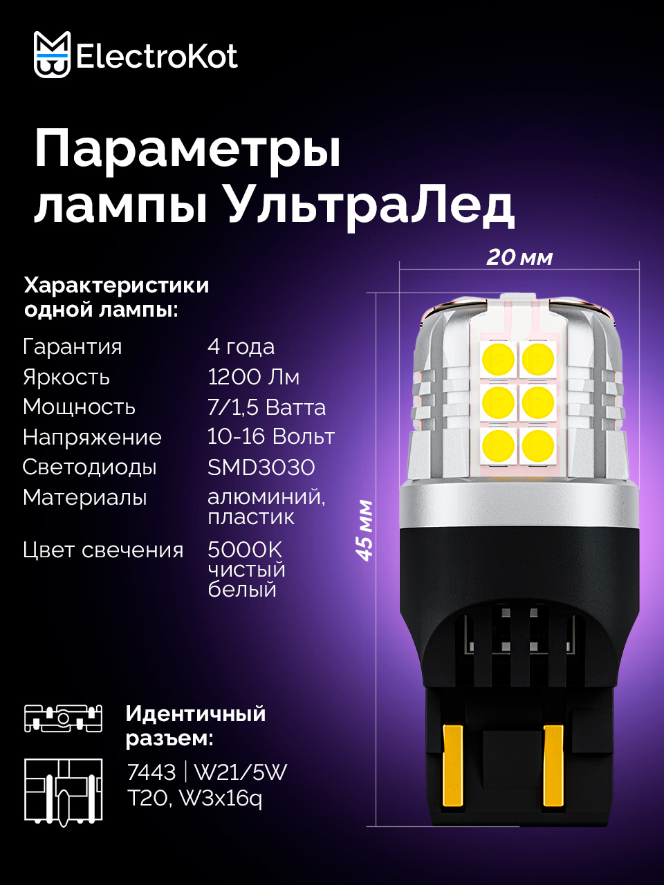 Светодиодная лампа для авто ЭлектроКот УльтраЛед W21/5W 7443 чистый белый 5000K 2 шт