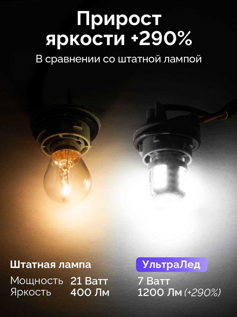 Светодиодные лампы для автомобилей серии УльтраЛед воплощают максимум яркости и надежности при сохранении компактных размеров. 300% яркости в сравнении со стандартной лампой накала.