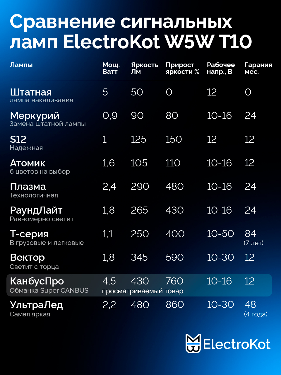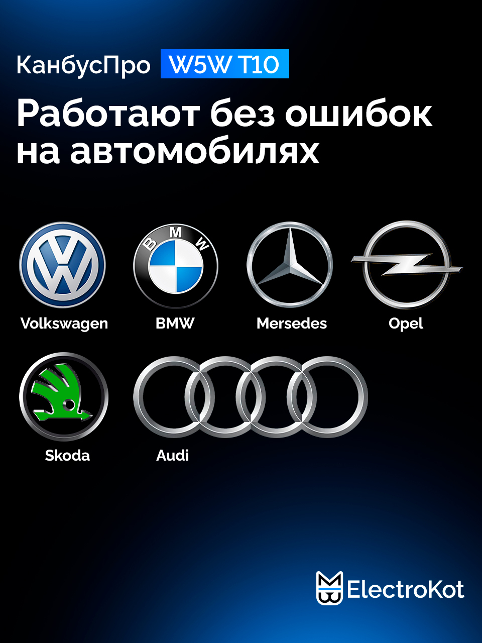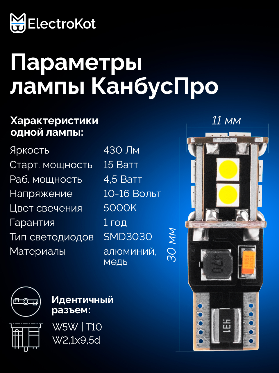 Светодиодные лампы для авто серии Канбус Про - самые мощные лампы W5W ассортимента ElectroKot. Оснащены резисторами на контактной группе. Подойдут для установки на автомобили с постоянным контролем мощности ламп.