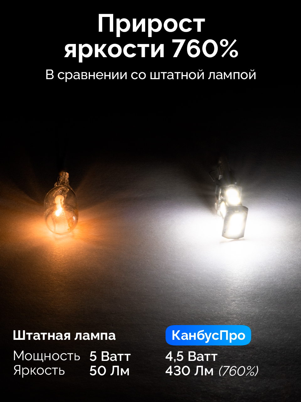 Обратите внимание, что мы не гарантируем 100% совместимость ламп с вашим автомобилем в габаритных огнях и подсветке номера. Встроенная обманка проходит опрос исправности ламп при их включении. В авто с системой постоянного контроля мощности ламп (некоторые модели VAG, Mercedes, BMW) может появится ошибка о неисправности лампы. Это не является гарантийным событием и товар можно вернуть в магазин как не подошедший. Для отключения ошибки необходимо добавить в сеть к каждой лампе нагрузочный резистор на 39 Ом или в прошивке автомобиля отключить контроль ламп (перевести его в режим LED).
