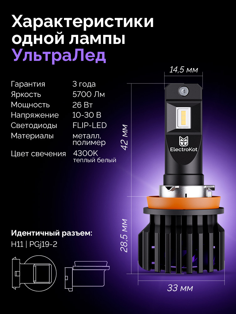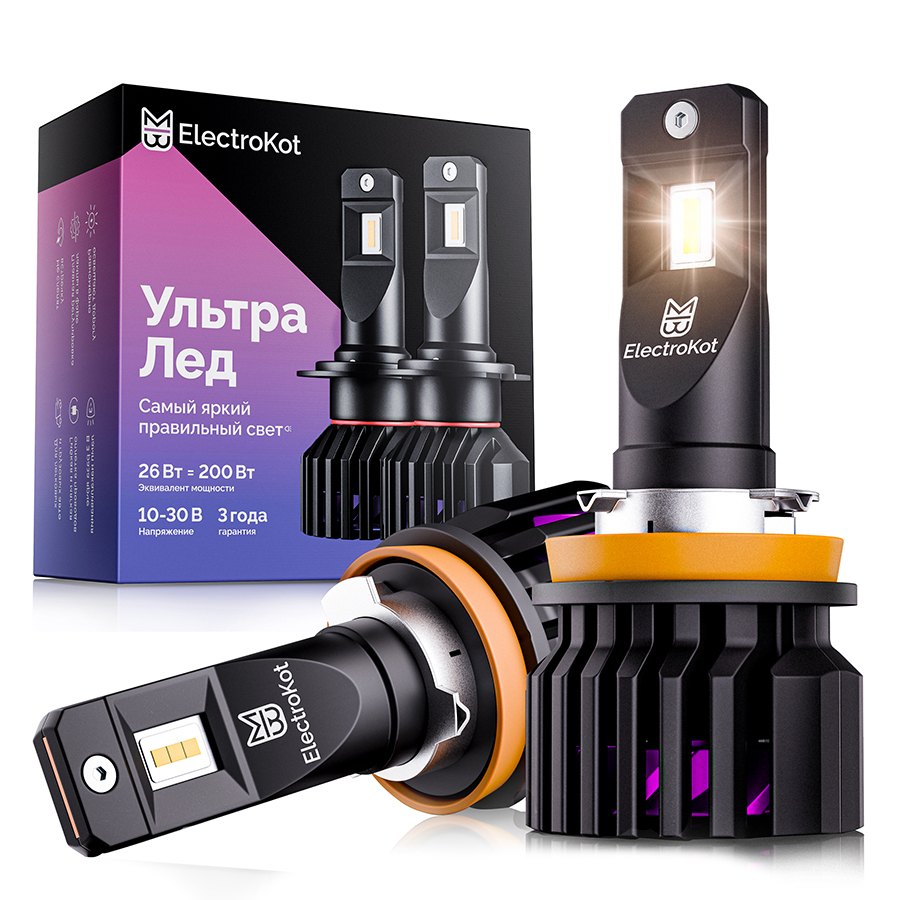 Светодиодные лампы для авто ЭлектроКот УльтраЛед gen2 H11 тёплый белый 4300K 2 шт