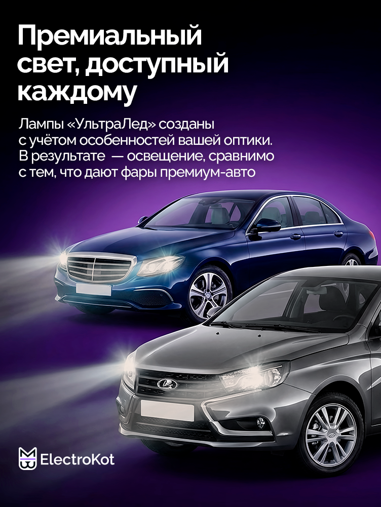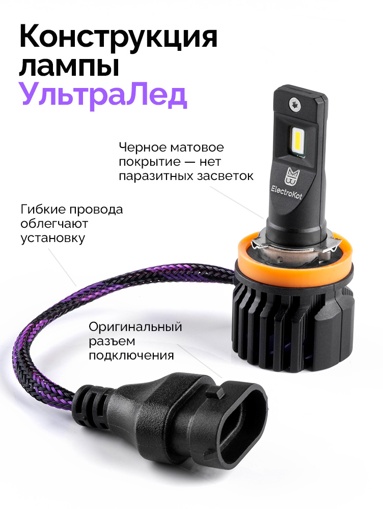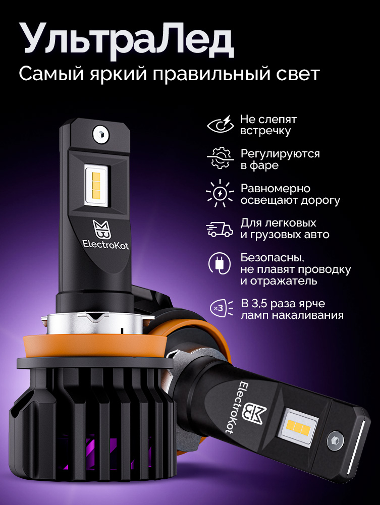 Светодиодные лампы для авто ЭлектроКот УльтраЛед - идеальное решение для фар с отражателями. Наша самая яркая модель с идеальной фокусировкой. Разработку этой модели мы вели несколько лет, основываясь на нашем опыте работы со светодиодными лампами головного освещения с 2013 года.