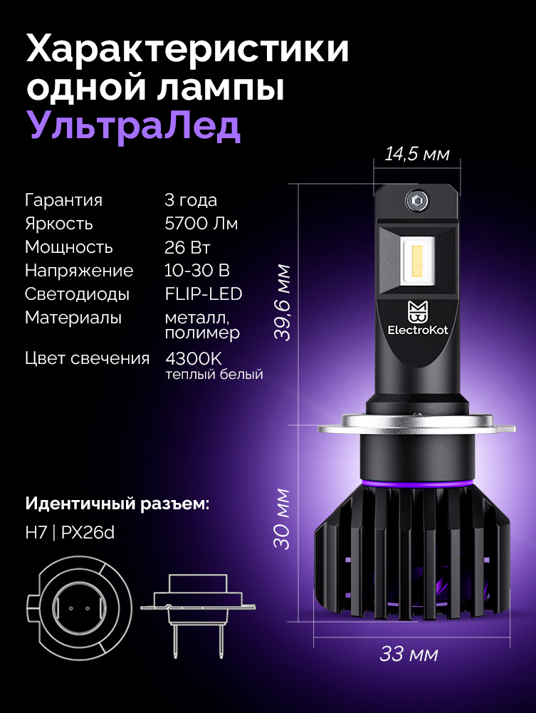 Светодиодные лампы для авто ЭлектроКот УльтраЛед gen2 H7 тёплый белый 4300K 2 шт