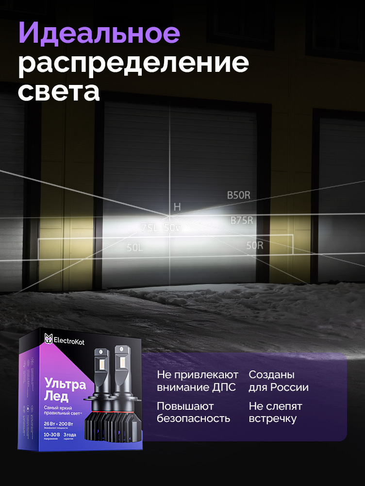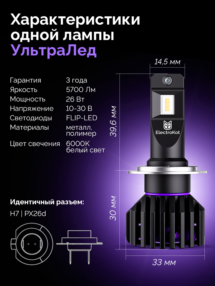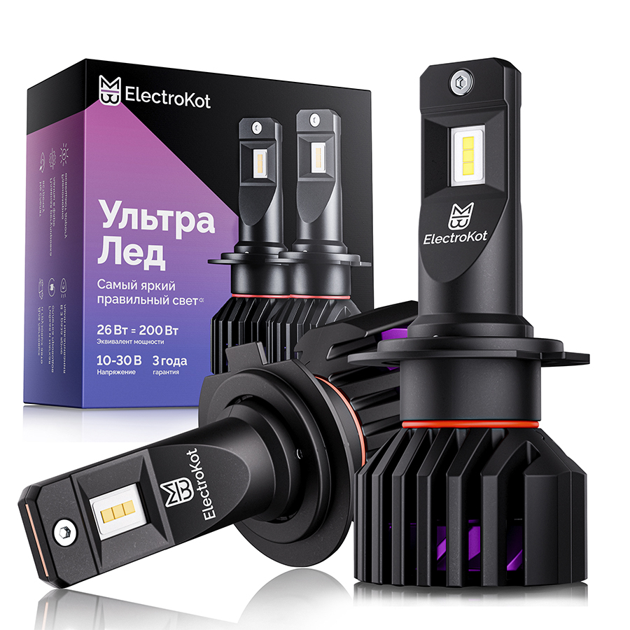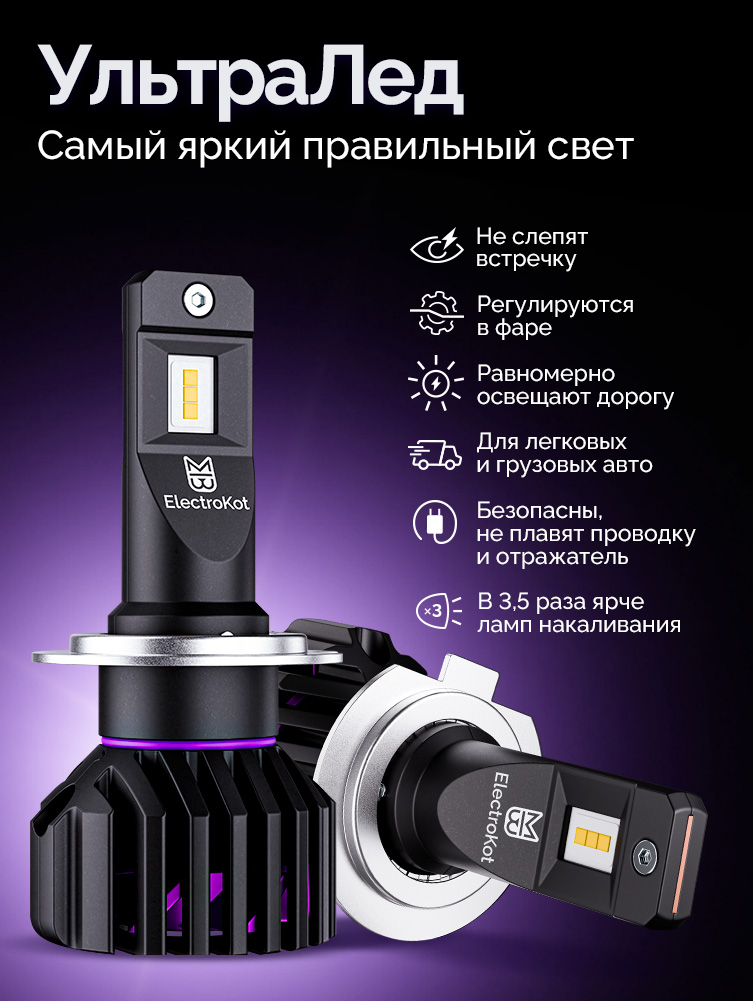 Светодиодные лампы для авто ЭлектроКот УльтраЛед - идеальное решение для фар с отражателями. Наша самая яркая модель с идеальной фокусировкой. Разработку этой модели мы вели несколько лет, основываясь на нашем опыте работы со светодиодными лампами головного освещения с 2013 года.