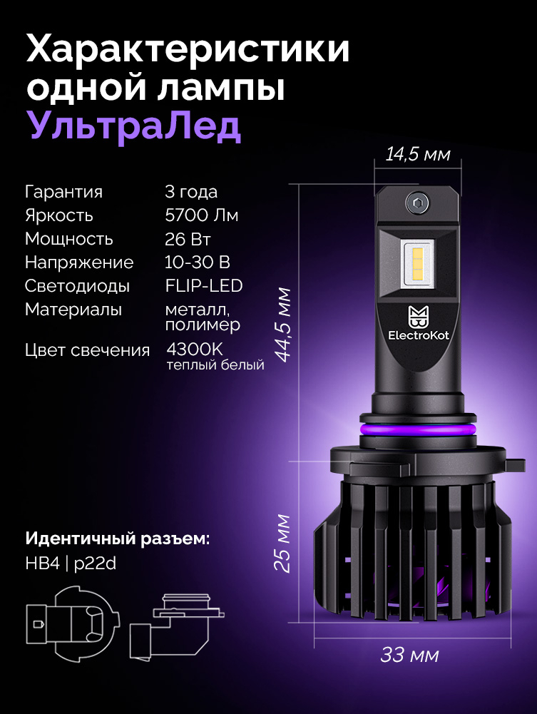 Светодиодные лампы для авто ЭлектроКот УльтраЛед gen2 HB4 тёплый белый 4300K 2 шт