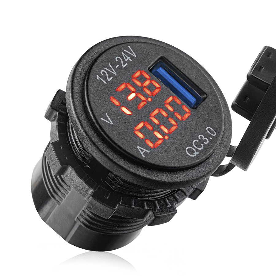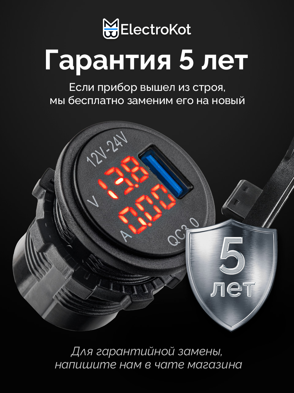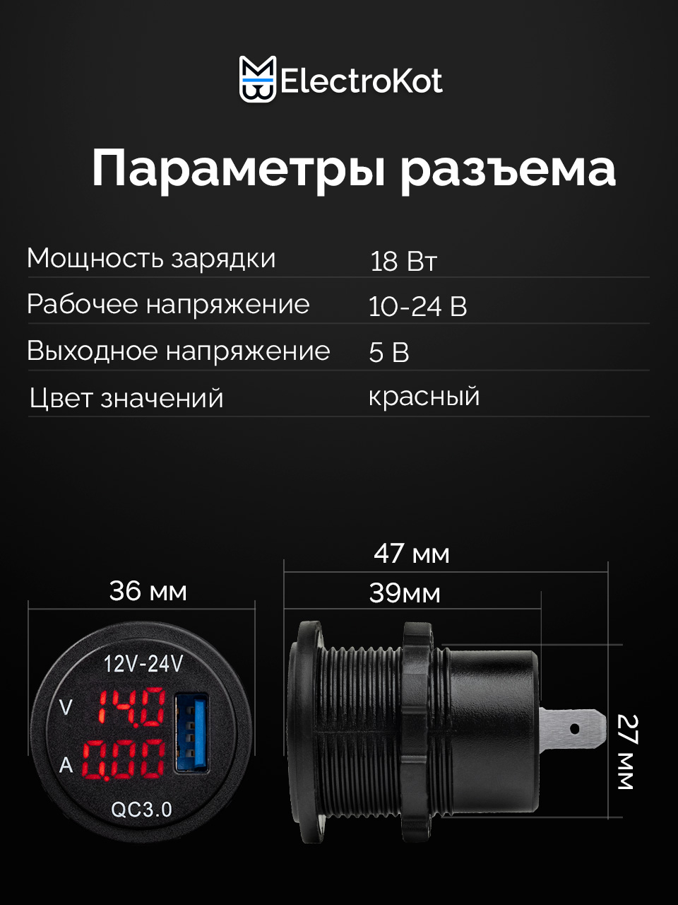 Разъём USB QC3.0 в авто врезной с вольтметром и амперметром ElectroKot 12-24В красная подсветка