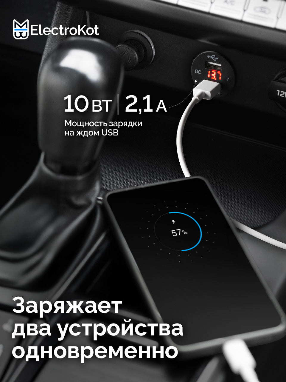 Данное дополнение является незаменимым устройством для вашего автомобиля. Оба разъема обеспечивают ток в 2,1А. Для увеличения КПД устройства, в него был добавлен вольтметр, который предельно точно определяет напряжение сети авто.