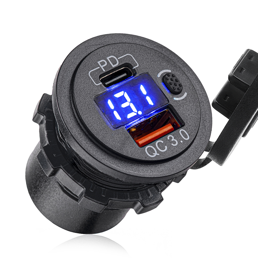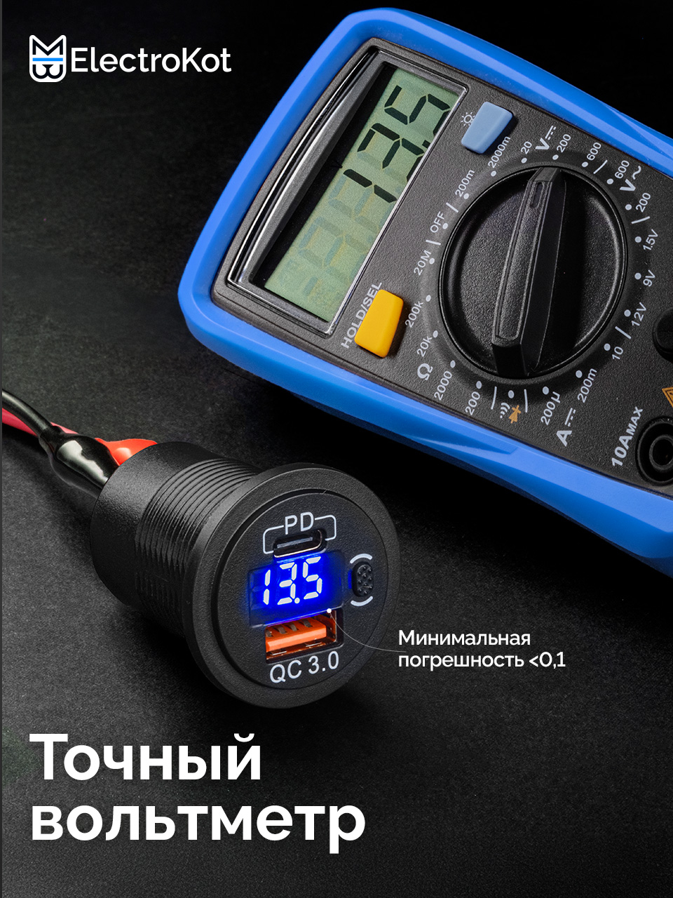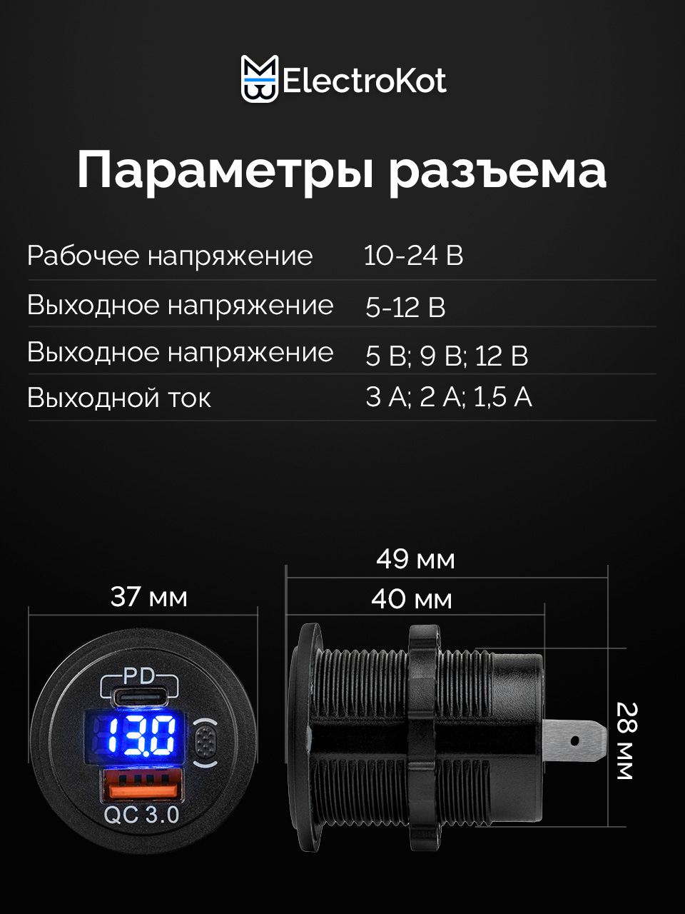 Разъем USB в авто врезной ElectroKot - розетка USB QC3.0 + Type-C PD с поддержкой быстрой зарядки. Дополнительно оснащен вольтметром, кнопкой вкл/выкл и синей подсветкой.