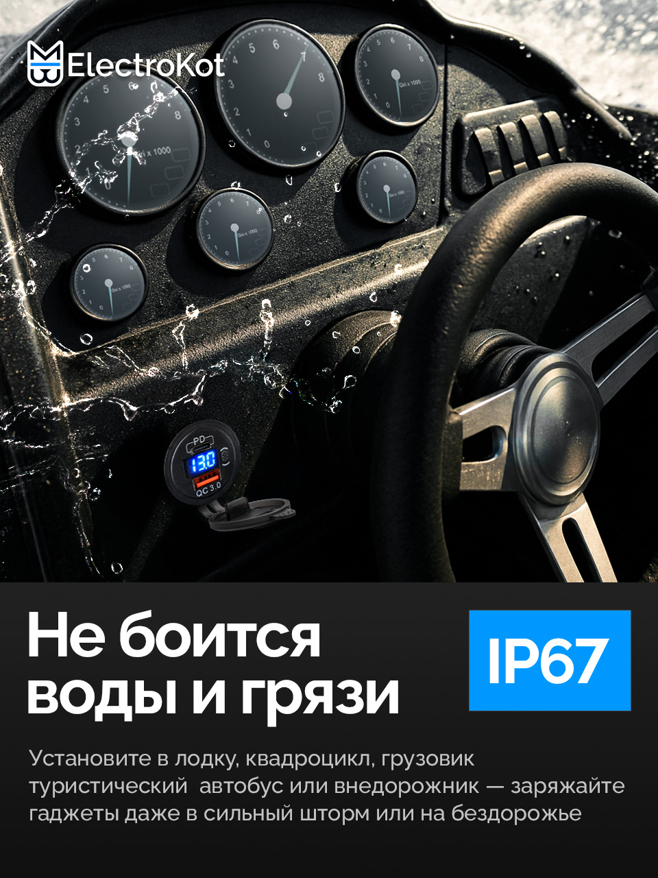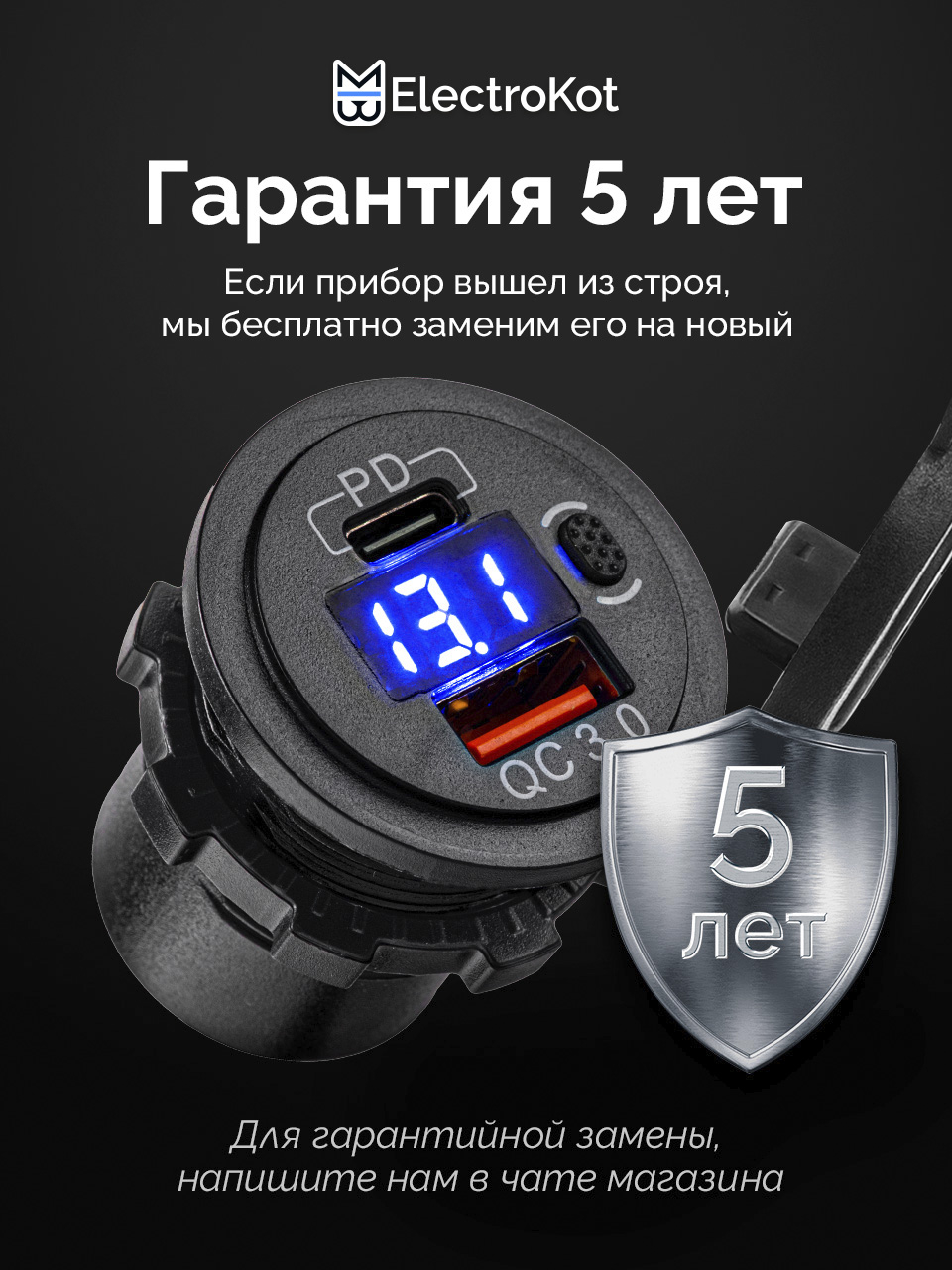 Разъем USB в авто врезной с вольтметром ElectroKot - розетка USB QC3.0 + Type-C PD быстрая зарядка с кнопкой синяя подсветка