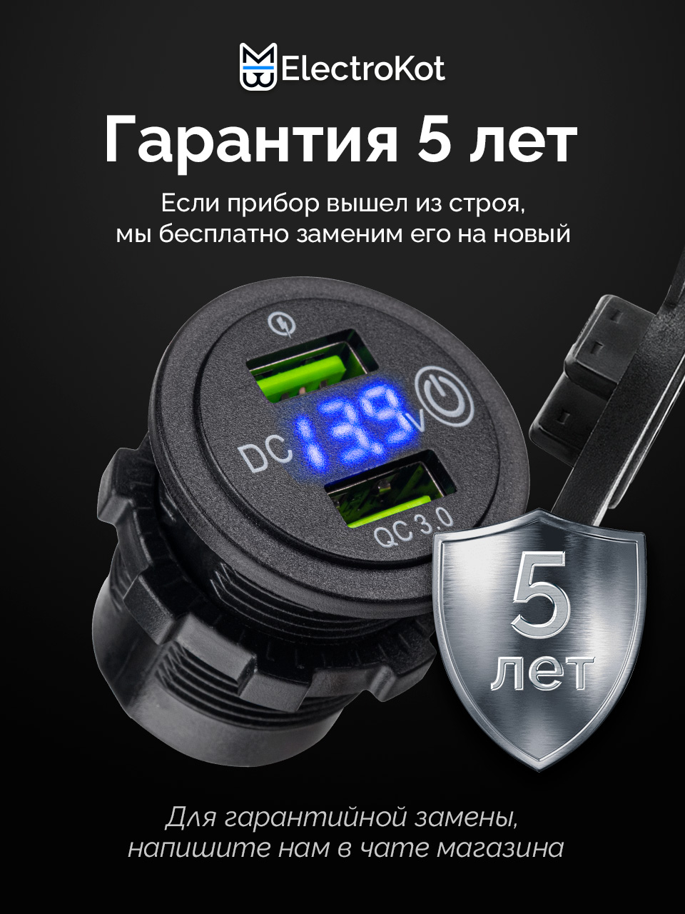 Разъем USB в авто врезной с вольтметром ElectroKot - розетка 2 USB QC3.0 быстрая зарядка с кнопкой синяя подсветка