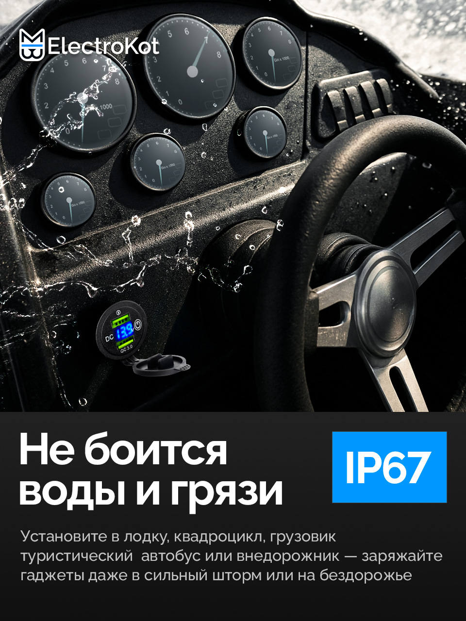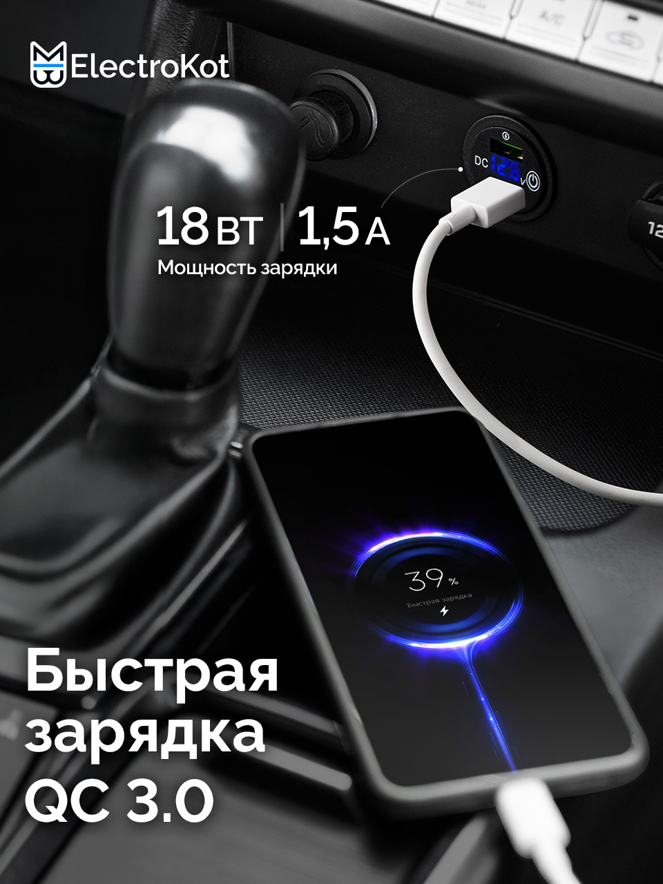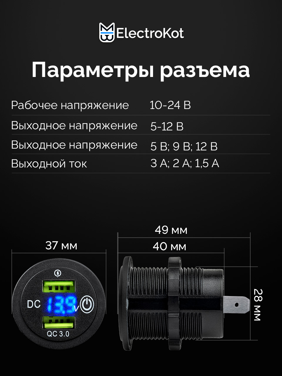 Разъем USB в авто врезной ElectroKot - розетка 2 USB QC3.0 с поддержкой быстрой зарядки. Оснащен вольтметром, кнопкой вкл/выкл и синей подсветкой.