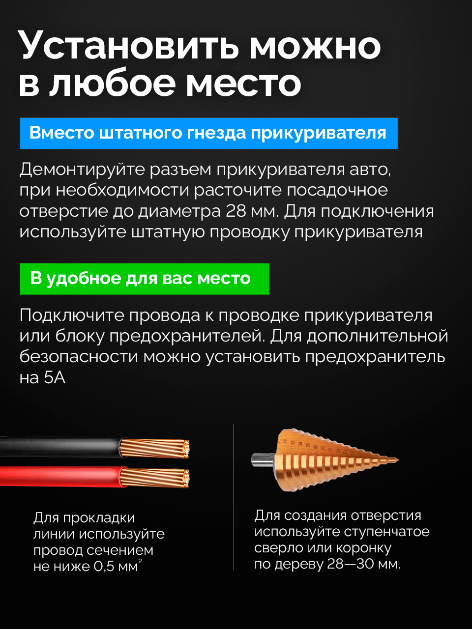 | Особенности | Вольтметр, быстрая зарядка, сенсорная кнопка Вкл/Выкл, 2 USB |
