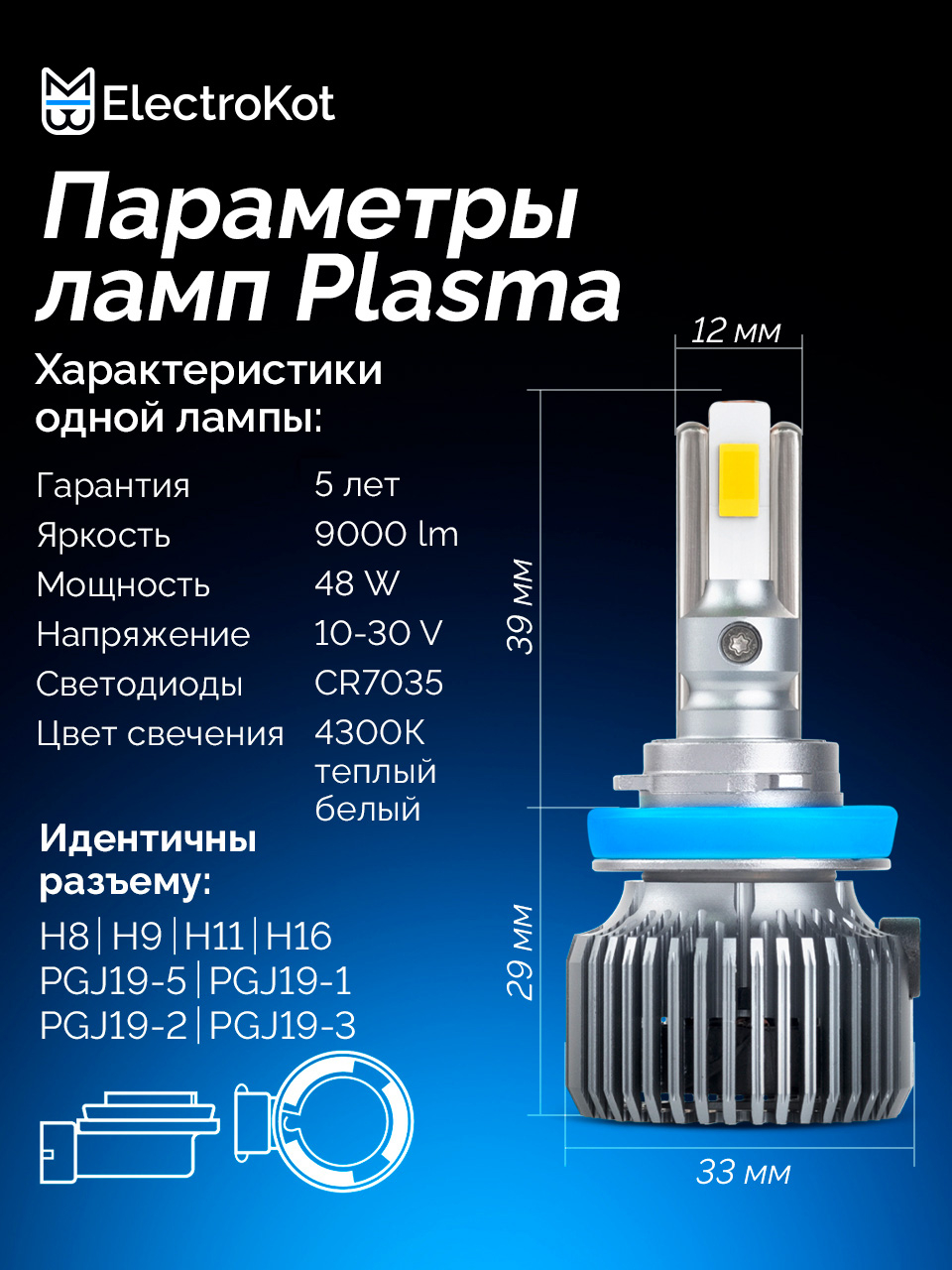Светодиодные LED лампы для авто ElectroKot Plasma теплый белый свет 4300K H11/H8/H9/H16 2 шт