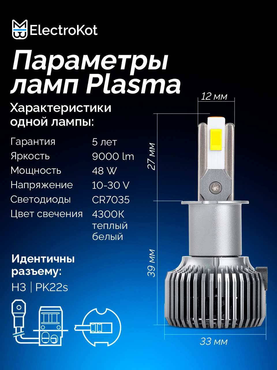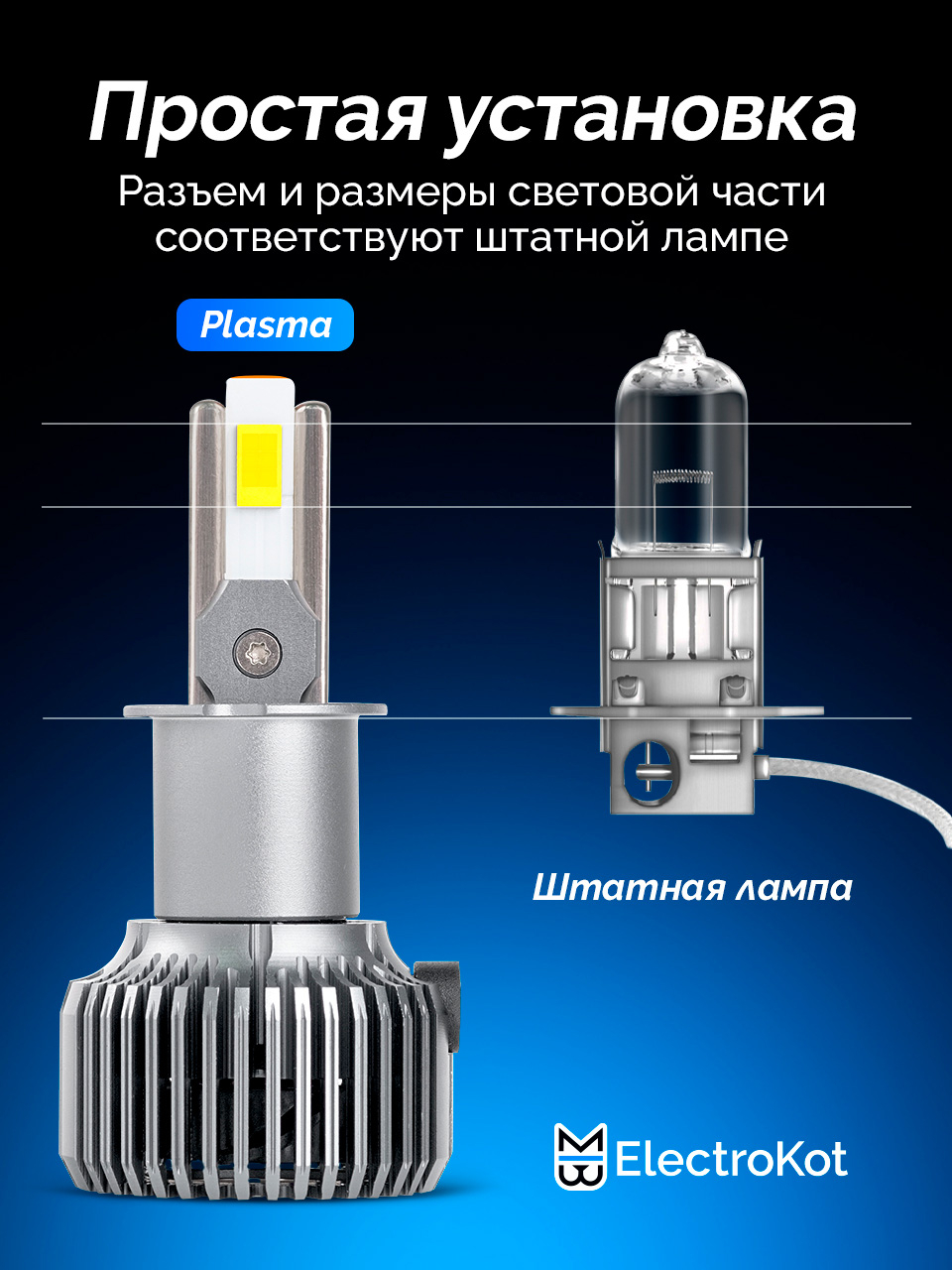 Светодиодные LED лампы для авто ElectroKot Plasma разработаны для установки в фары с линзой или в секцию дальнего света. Выделяются высокой яркостью, компактными размерами и долговечностью. Особая форма световой части позволяет максимально эффективно использовать потенциал фар и получать максимум света на дороге.