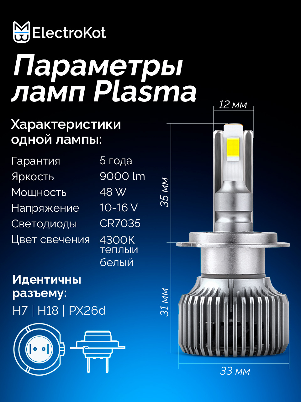 Светодиодные LED лампы для авто ElectroKot Plasma теплый белый свет 4300K H7 2 шт