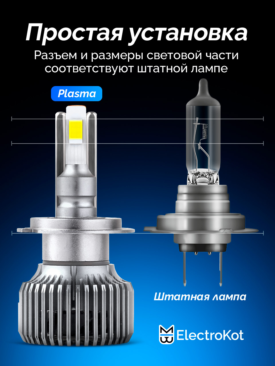 Светодиодные LED лампы для авто ElectroKot Plasma разработаны для установки в фары с линзой или в секцию дальнего света. Выделяются высокой яркостью, компактными размерами и долговечностью. Особая форма световой части позволяет максимально эффективно использовать потенциал фар и получать максимум света на дороге.