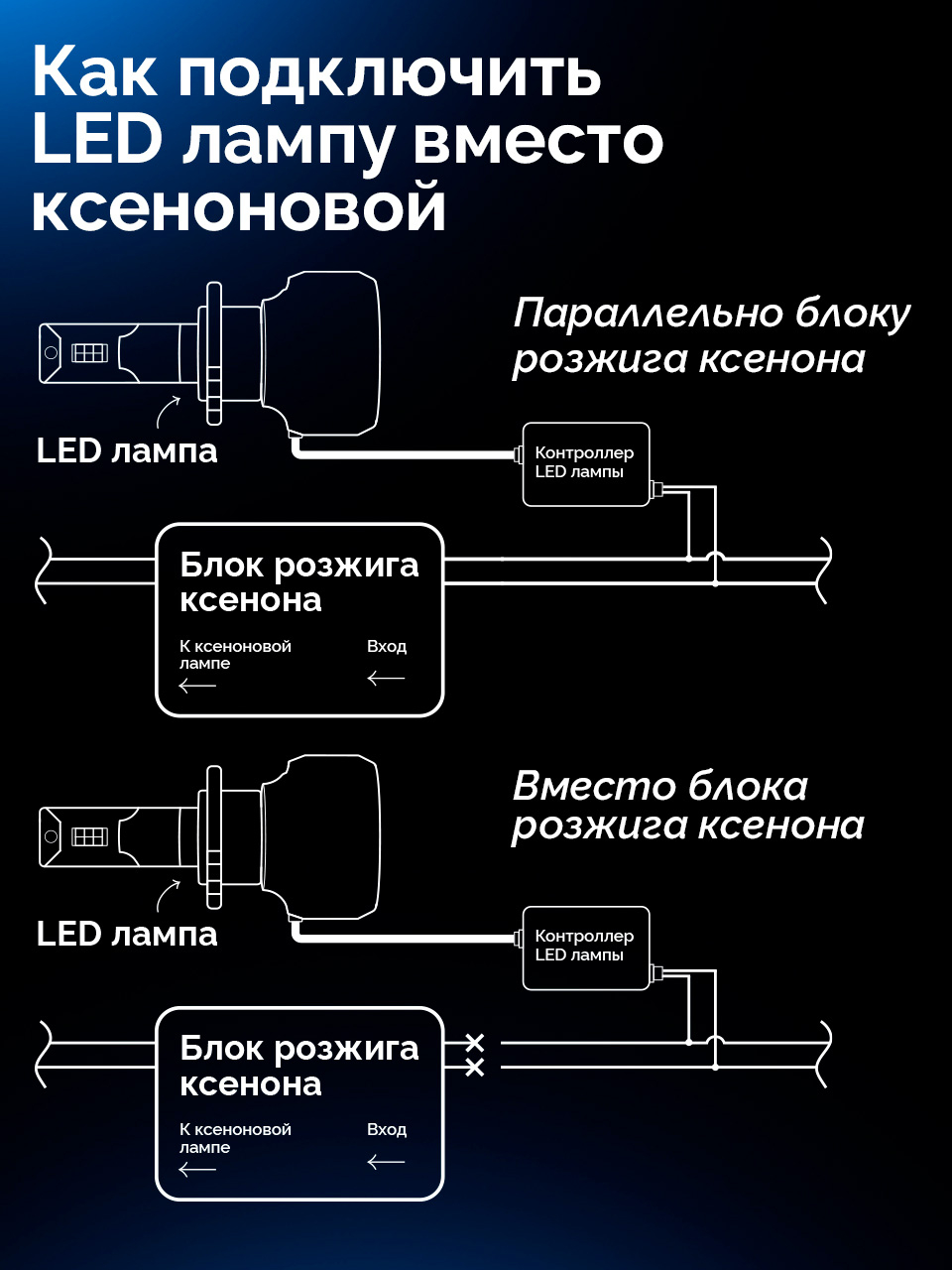 - Подключите проводку светодиодной лампы к проводке авто перед блоком розжига. (Штатный блок розжига использоваться не будет)