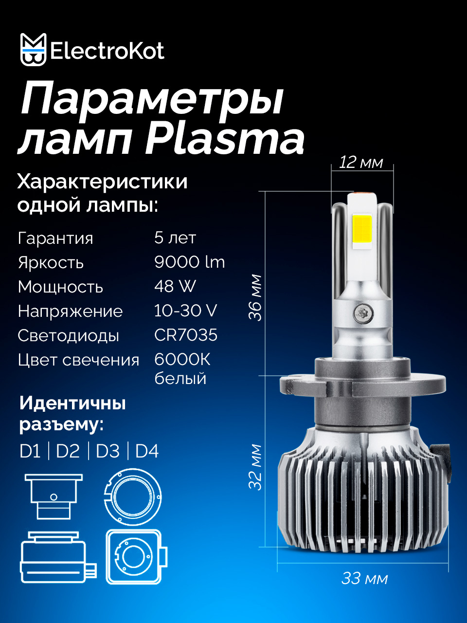 Светодиодные LED лампы для авто ElectroKot Plasma белый свет 6000K D1/D2/D3/D4/D5/D8 12В 2 шт