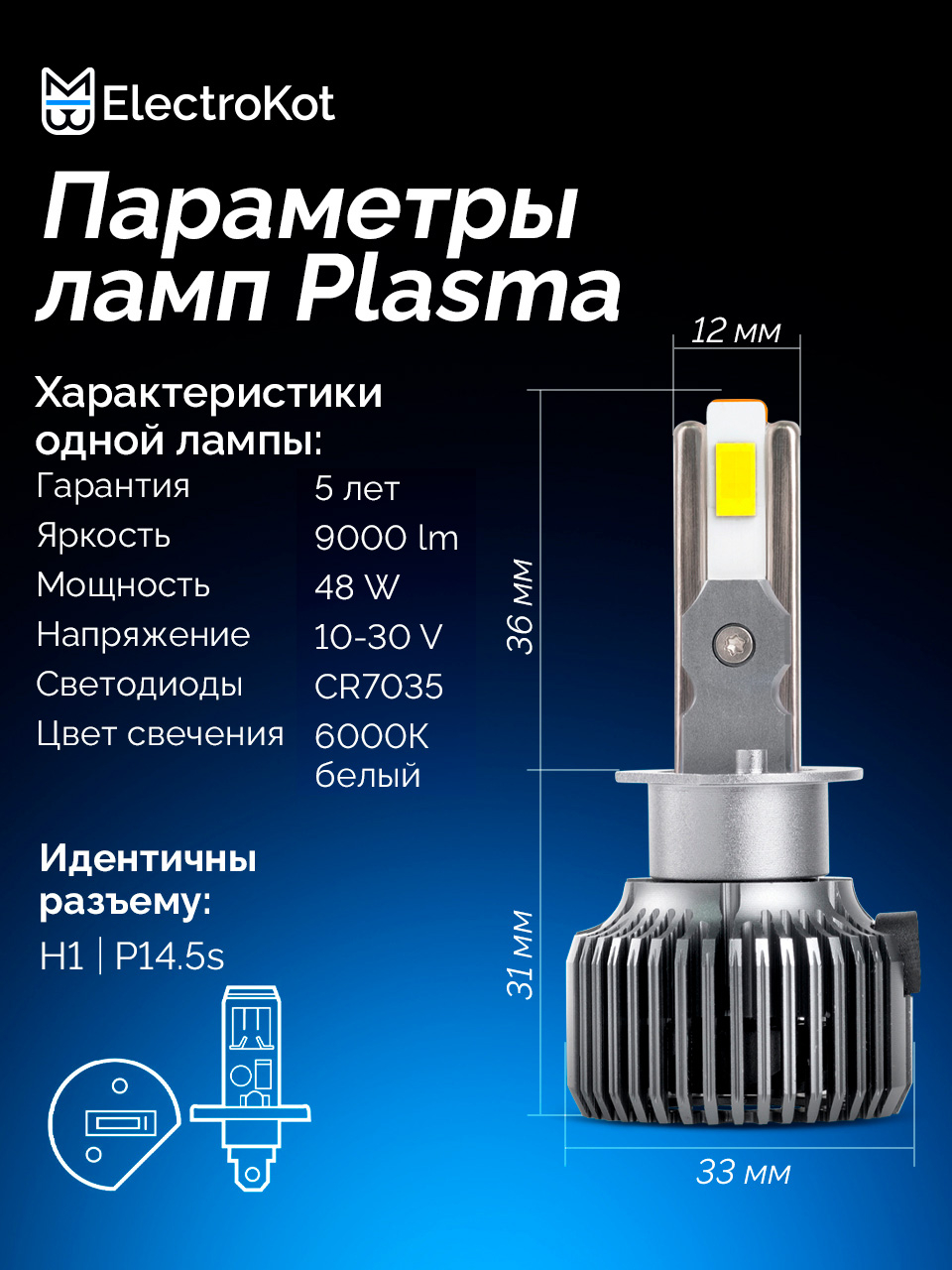 Светодиодные LED лампы для авто ElectroKot Plasma разработаны для установки в фары с линзой или в секцию дальнего света. Выделяются высокой яркостью, компактными размерами и долговечностью. Особая форма световой части позволяет максимально эффективно использовать потенциал фар и получать максимум света на дороге.