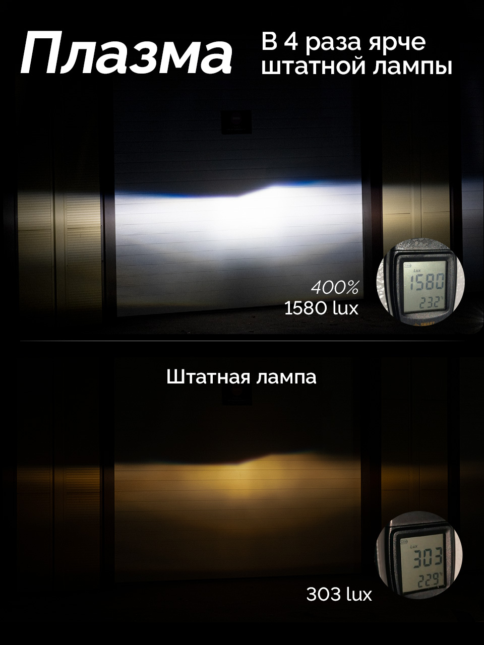 Сравнение свечения штатной галогенной лампы и LED лампы ElectroKot Plasma, на лампы подано напряжение 13,7 Вольт: