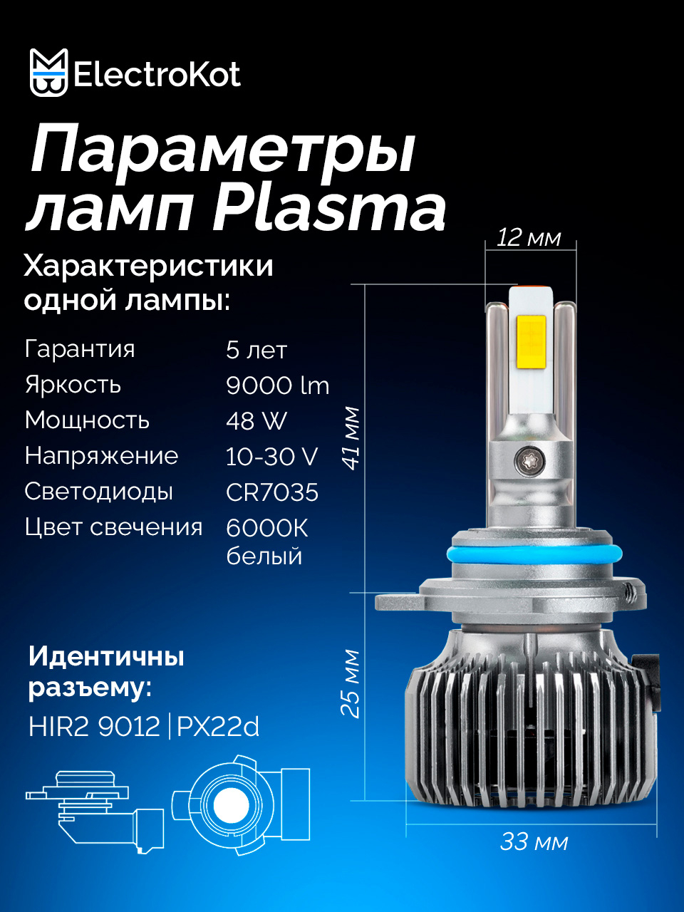 Светодиодные LED лампы для авто ElectroKot Plasma разработаны для установки в фары с линзой или в секцию дальнего света. Выделяются высокой яркостью, компактными размерами и долговечностью. Особая форма световой части позволяет максимально эффективно использовать потенциал фар и получать максимум света на дороге.