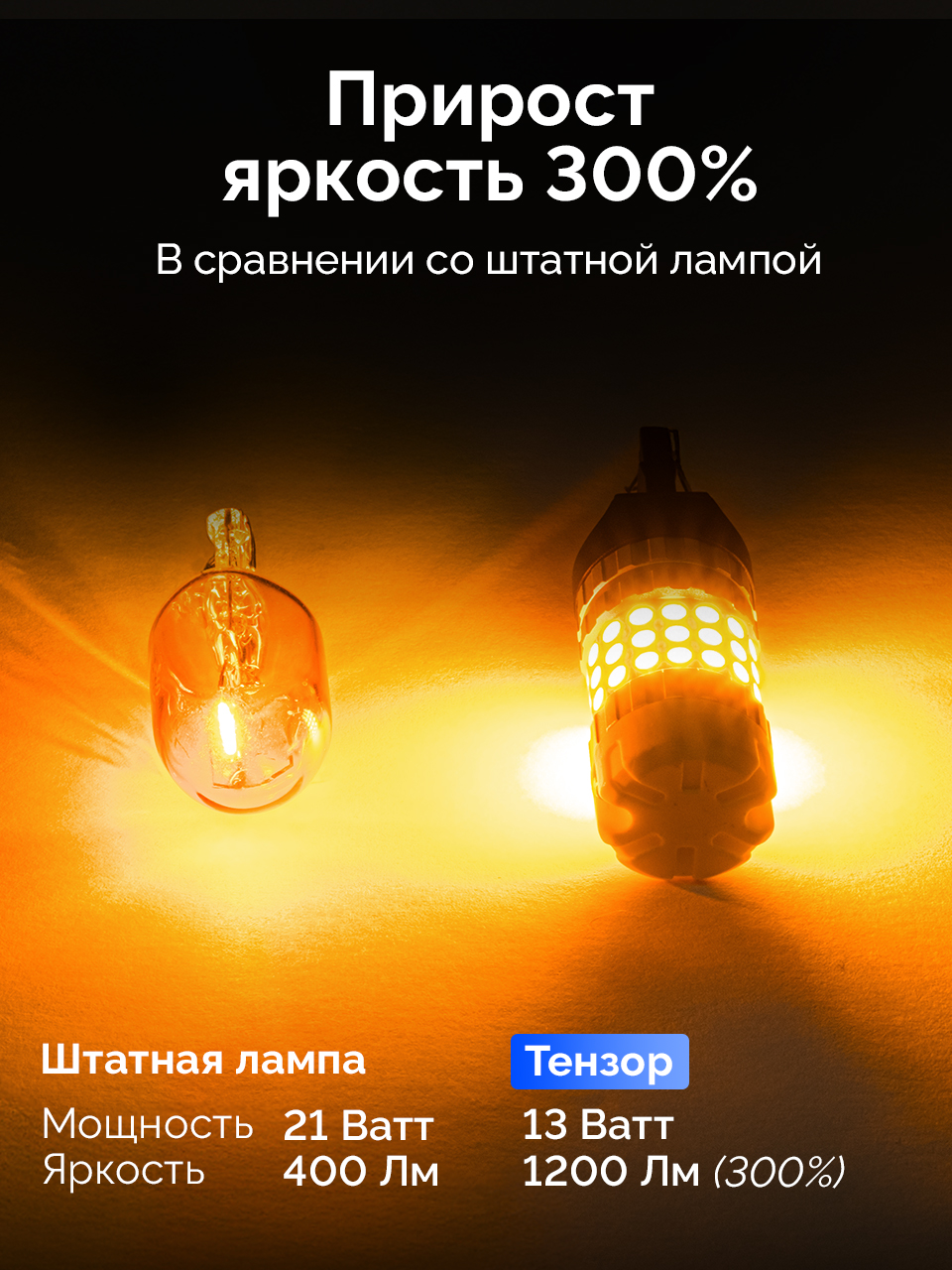 Светодиодная лампа серии Тензор оснащена интеллектуальной нагрузочной обманкой, подключаемой на ограниченное время в момент запуска. Это решение позволяет обходить системы контроля и сохранять частоту мигания в повторителях поворота. В отличие от других LED ламп, где вся потребляемая мощность испускается в виде света, яркость ламп Тензор не превышает комфортные параметры.