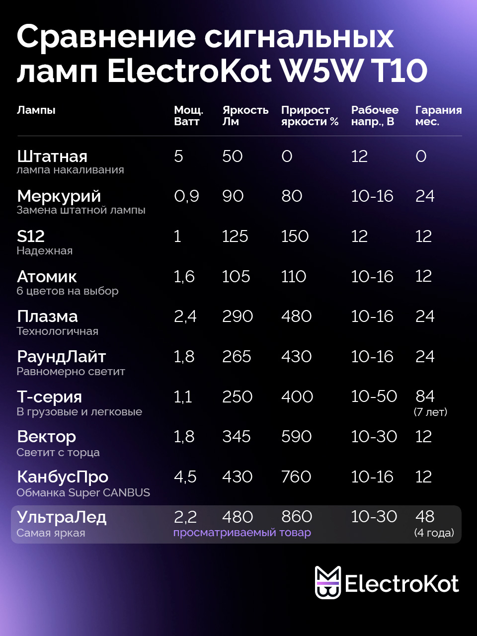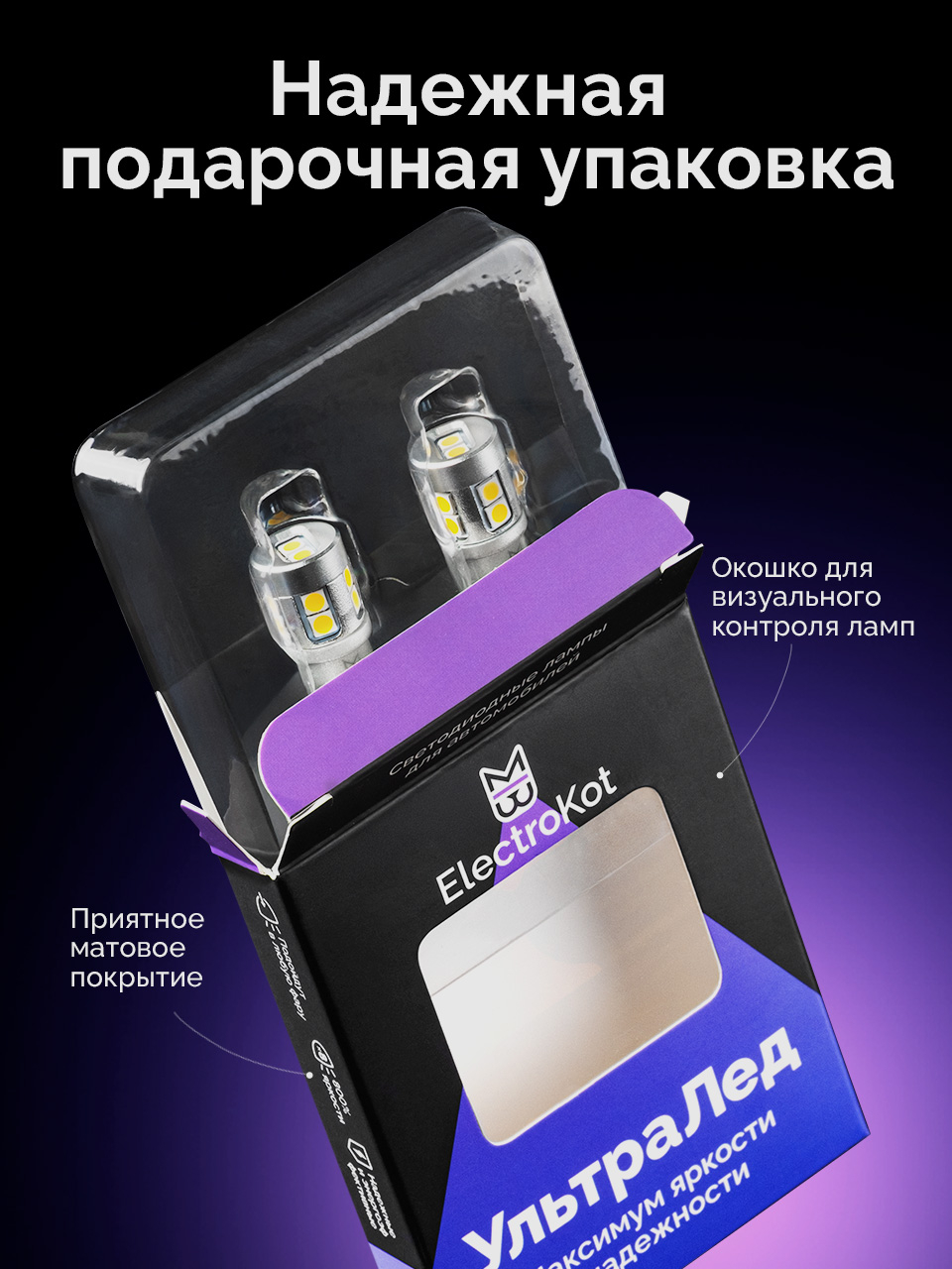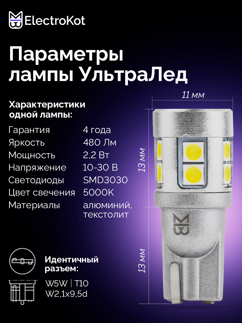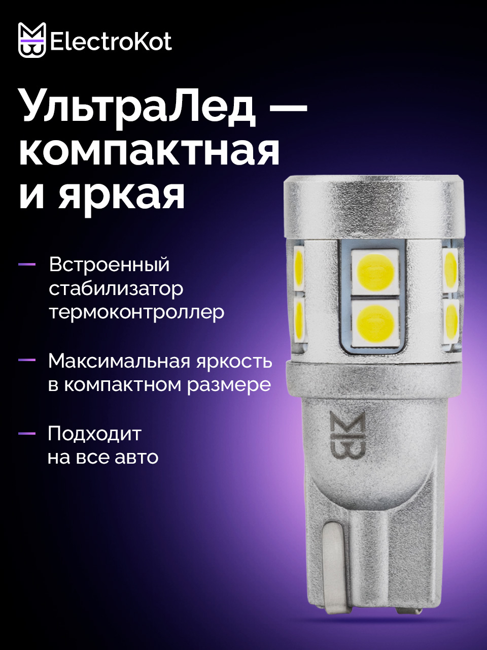- 2 х Светодиодная лампа для авто ЭлектроКот УльтраЛед W5W