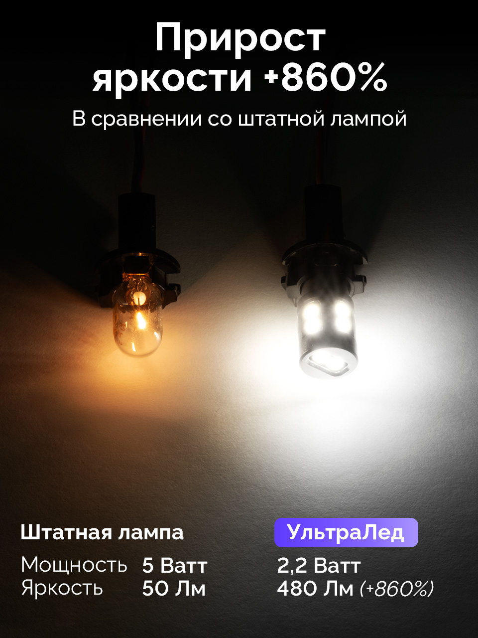 - Светит в 9 раз ярче штатной лампы при мощности 2,2 Вт. Всё благодаря 10 инновационным LED чипам