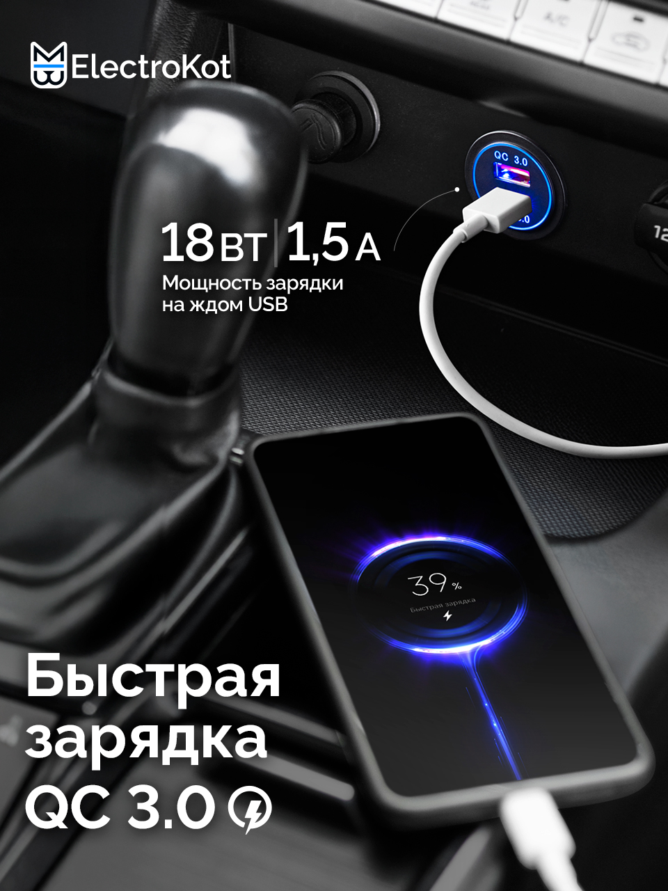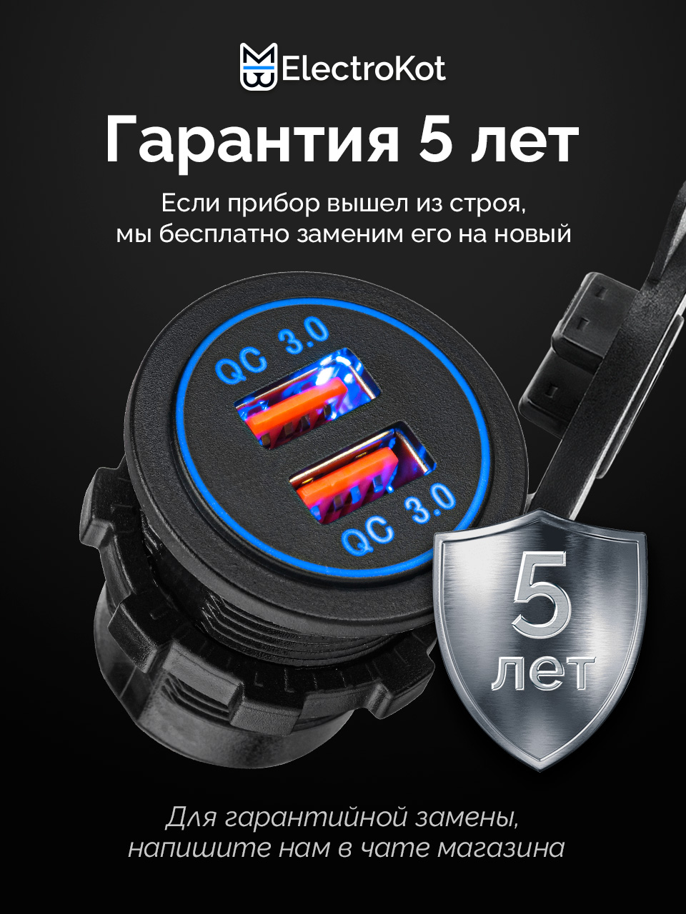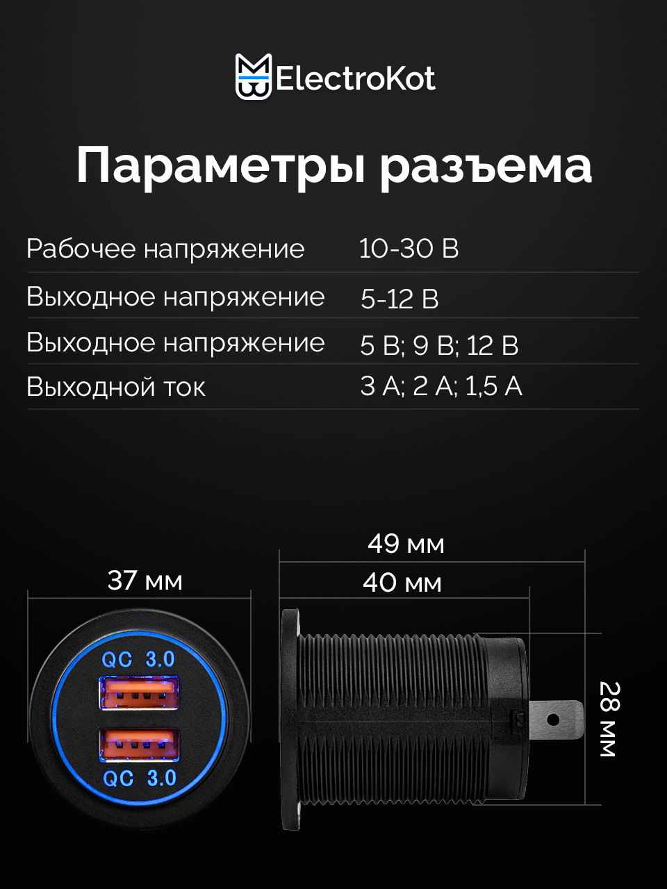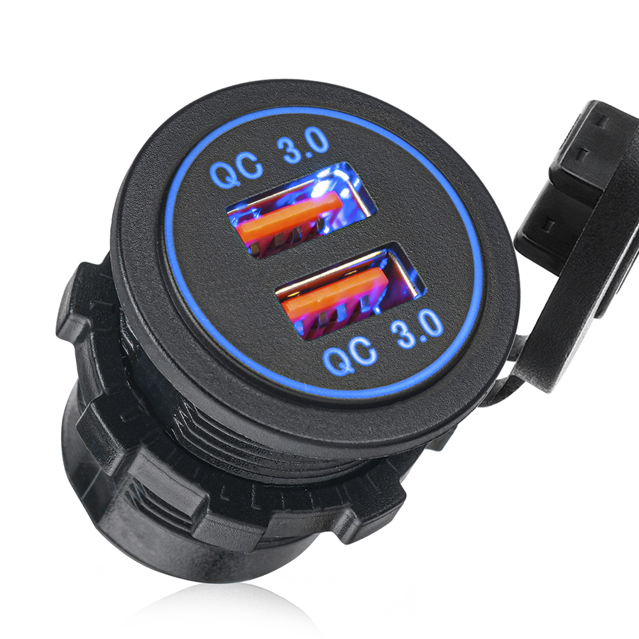 Разъем USB в авто врезной ElectroKot - розетка 2 USB QC3.0 быстрая зарядка синяя подсветка